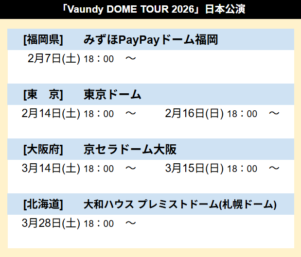 Vaundy!ドームツアー2026の会場は、4会場6公演となっています。
